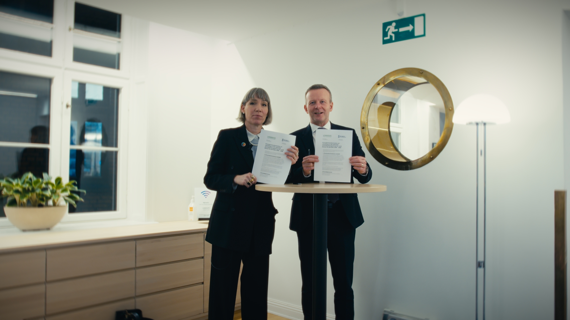 Mikael Frisell, generaldirektör för Myndigheten för civilt försvar och Darja Isaksson, generaldirektör för Vinnova skriver under överenskommelsen den 19 januari 2026.