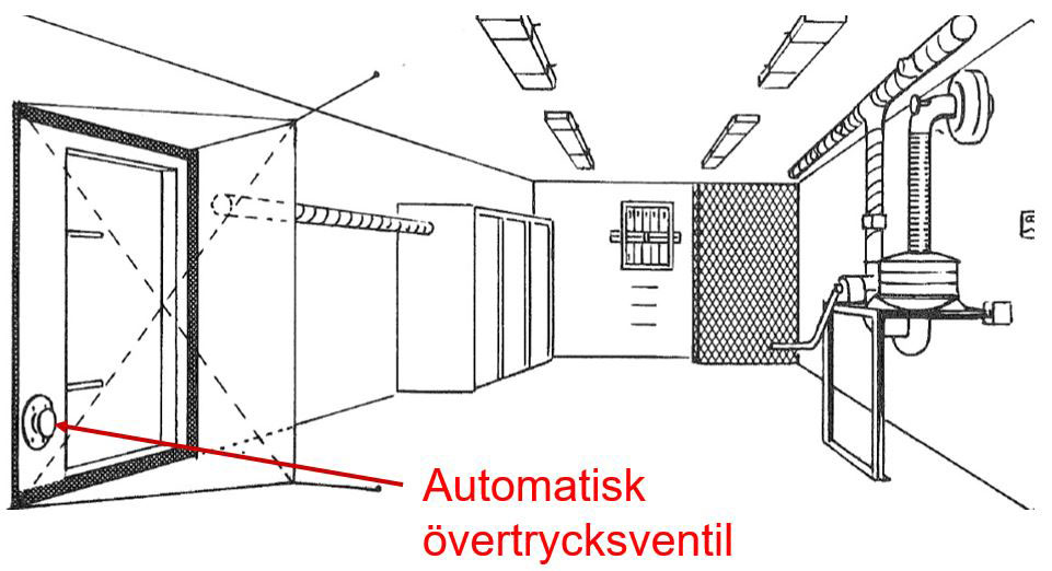 Med hjälp av övertrycket som skapas inne i skyddsrummet kan förbrukad luft släppas ut genom övertrycksventilen.