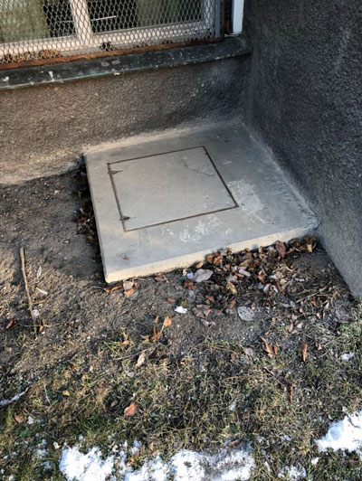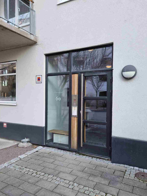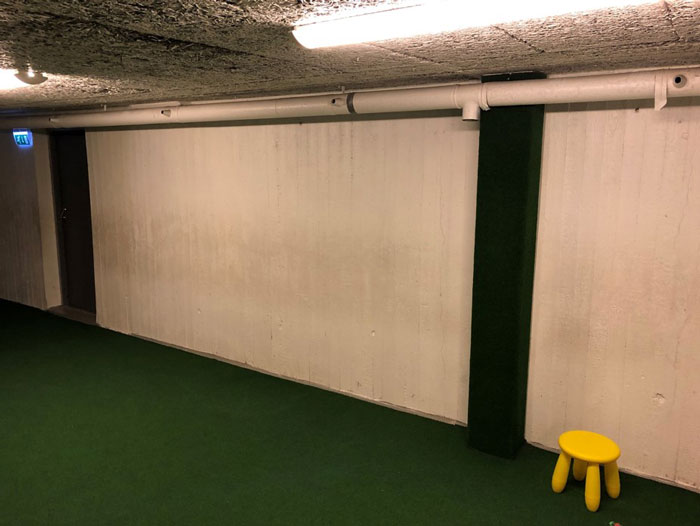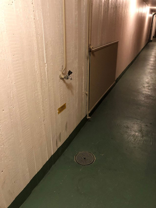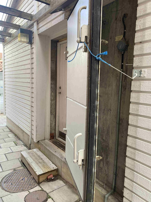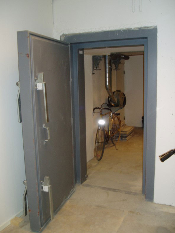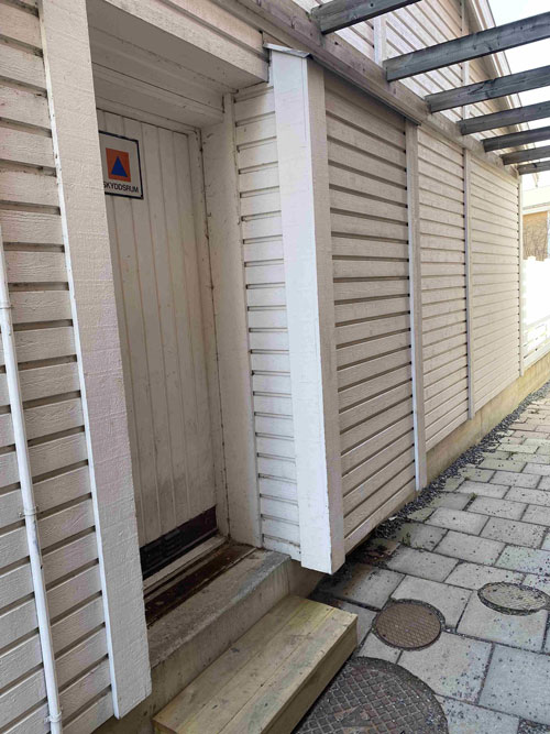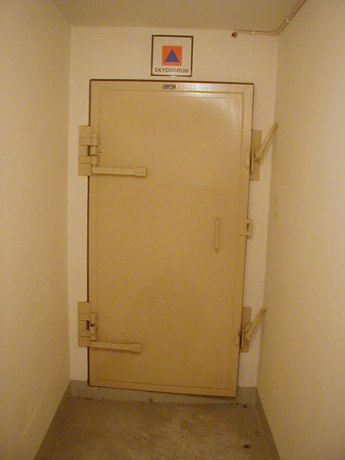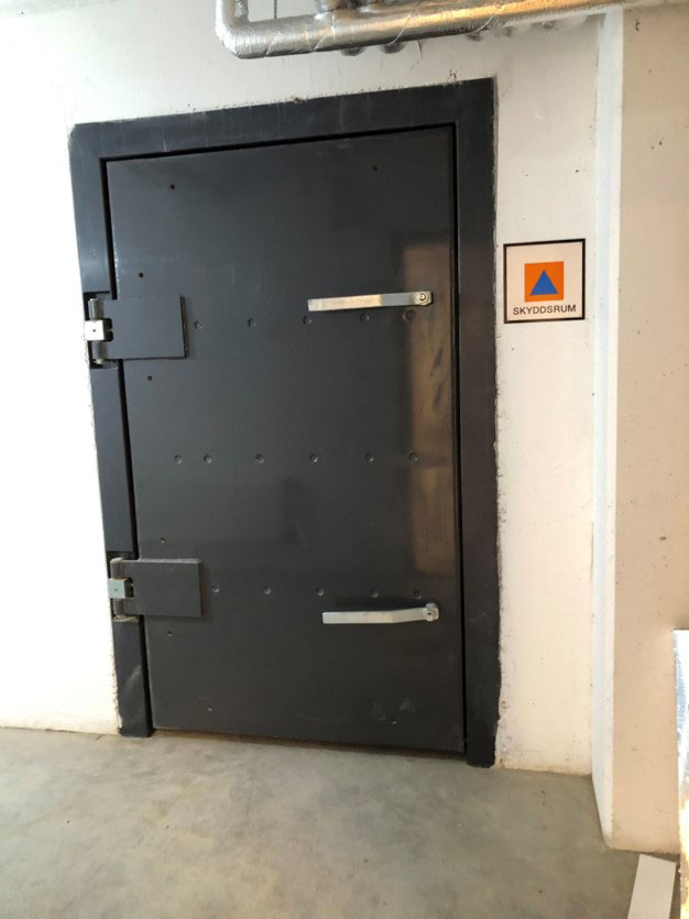 Dörren längst ner är försedd med splitterskyddsplåtar. Det ska finnas på skyddsrumsdörrar typ 3 där dörren leder ut i det fria.