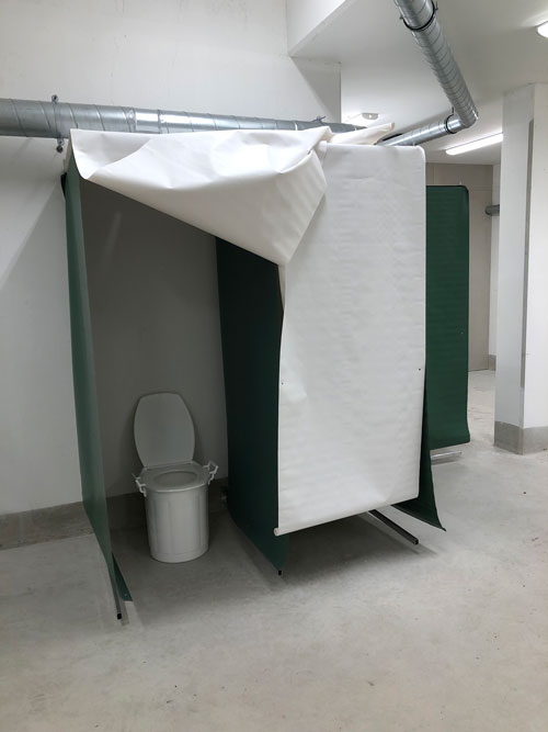 Äldre skyddsrum är utrustade med toalettkärl av papp med tillhörande plastsäckar. Nyare skyddsrum har toalettkärl av plast och det ska då vara tre plastkärl för varje toalettutrymme.