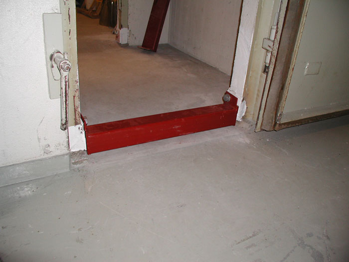 Finns både fast och monterbar tröskel. I fredstid ska den monterbara tröskeln ligga i skyddsrumsförrådet och monteras först vid ett eventuellt iordningställande.
