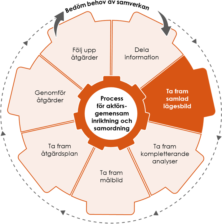 Process för samlad lägesbild är en generell och kortfattad beskrivning över de olika delmoment och steg som genomförs under lägesbildsarbetet. Processen ger en översikt över hur arbetet går till från ...