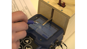 Konstanskontroll: Viktigt att instrumentet ligger plant och tätt intill den främre väggen på intensimeterprovaren för att få ett korrekt värde.