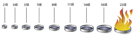 Ett provbål för B-brand består av ett cirkulärt plåtkärl med 2/3 heptan och 1/3 vatten. Siffran i effektivitetsklassen anger storleken på provbålet och representerar den totala mängden vätska i liter, men även radien på provbålet i kvadrat.