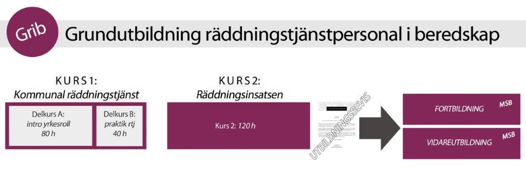 Grib – Grundutbildning för räddningstjänstpersonal i beredskap – är en 6 veckor lång utbildning. Bilden visar en översikt över hela utbildningen.Utbildningen ska ge förutsättningar att arbeta som räddningstjänstpersonal i beredskap i kommunal räddningstjänst. Utbildningen ger förutsättningar att kunna förbereda och genomföra räddningsinsatser vid vanligt förekommande olyckor, som till exempel brand i byggnader och trafikolyckor. Den ger också kunskaper för att kunna medverka i större räddningsinsatser och för att kunna hantera extraordinära händelser i samhället.