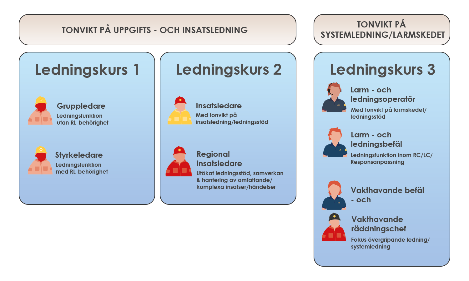 - Ledningskurs 1 som har tonvikt på uppgifts- och insatsledning